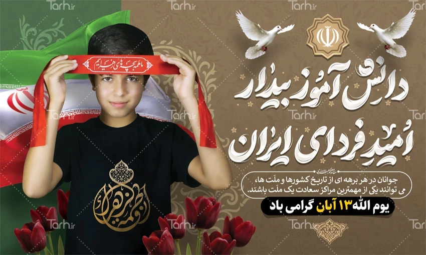 بنر لایه باز 13 آبان و فاطمیه با فرمت psd و قابل ویرایش در نرم افزار فتوشاپ به صورت لایه باز توسط تیم طراحان طرح دات آی آر طراحی شده است. در طرح بنر 13 آبان و ایام فاطمیه از تصاویر و المان های با کیفیت و متناسب با استاندارد چاپ استفاده گردیده است. طرح بنر روز دانش آموز و شهادت حضرت زهرا شامل عکس دانش آموز و تایپوگرافی دانش آموز بیدار امید فردای ایران می باشد که المان های استفاده شده در طرح لایه باز بنر دانش آموز و فاطمیه قابلیت ویرایش، جابه جایی و تغییر سایز را دارا بوده و شما می توانید متناسب با سلیقه خودتان طرح 13 آبان را ویرایش نمایید.