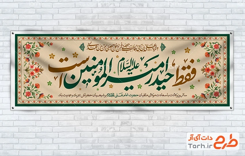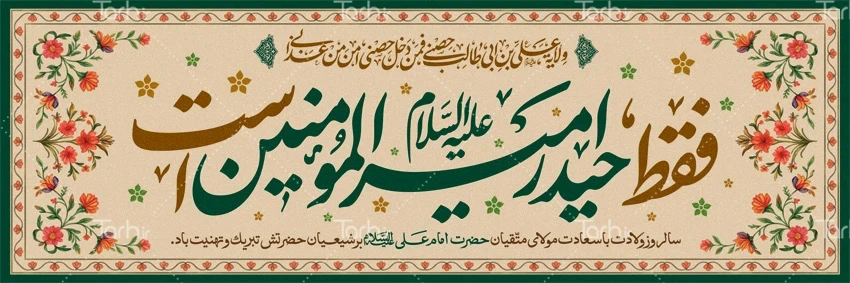 نمونه پلاکارد میلاد حضرت علی شامل خوشنویسی فقط حیدر امیرالمومنین است کد فایل 4287590