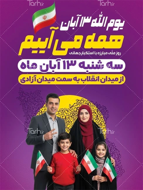 دانلود بنر اطلاعیه راهپیمایی 13 آبان با فرمت psd و قابل ویرایش در نرم افزار فتوشاپ به صورت لایه باز توسط تیم طراحان طرح دات آی آر طراحی شده است. در طرح بنر راهپیمایی 13 آبان از تصاویر و المان های با کیفیت و متناسب با استاندارد چاپ استفاده گردیده است. طرح پوستر اطلاعیه راهپیمایی روز دانش آموز شامل عکس دانش آموز و زمان و مکان تجمع می باشد که المان های استفاده شده در طرح لایه باز بنر روز دانش آموز قابلیت ویرایش، جابه جایی و تغییر سایز را دارا بوده و شما می توانید متناسب با سلیقه خودتان طرح اطلاع رسانی راهپیمایی 13 آبان را ویرایش نمایید.