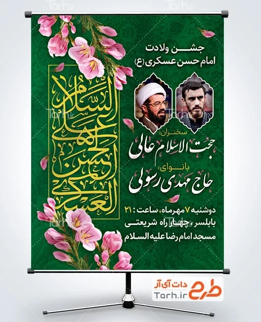 طرح بنر اطلاع رسانی میلاد امام حسن عسکری با فرمت psd و قابل ویرایش در نرم افزار فتوشاپ به صورت لایه باز توسط تیم طراحان طرح دات آی آر طراحی شده است. در طرح لایه باز ولادت امام حسن عسکری از تصاویر و المان های با کیفیت و متناسب با استاندارد چاپ استفاده گردیده است. طرح لایه باز بنر اطلاع رسانی ولادت امام حسن عسکری شامل خوشنویسی السلام علی الحسن العسکری و وکتور گل می باشد که المان های استفاده شده در پوستر لایه باز ولادت امام حسن عسکری قابلیت ویرایش، جابه جایی و تغییر سایز را دارا بوده و شما می توانید متناسب با سلیقه خودتان طرح پوستر اطلاعیه ولادت امام حسن عسکری را ویرایش نمایید.