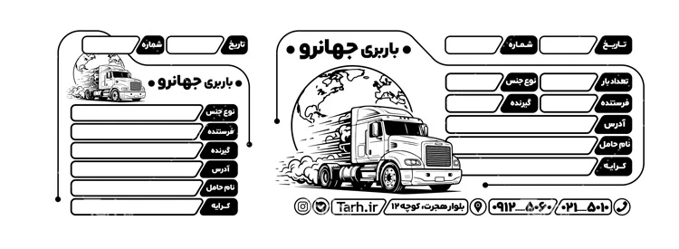 دانلود قبض ریسو باربری با فرمت psd و قابل ویرایش در نرمافزار فتوشاپ بهصورت لایه باز توسط تیم طراحان طرح دات آی آر طراحی شده است. در نمونه قبض باربری از تصاویر و المانهای باکیفیت و متناسب با استاندارد چاپ استفادهشده، همچنین نکات مهم در طرح قبض رسید باربری مانند رنگبندی، رعایت حاشیه، فاصلهها، فضای کافی برای درج متن، سایز و نوع فونت مناسب قبض باربری خام و ... رعایت گردیده است. طرح لایه باز قبض باربری شامل وکتور ماشین باربری میباشد که المانهای استفادهشده در فرم خام قبض بار بری قابلیت ویرایش، جابهجایی و تغییر سایز را دارا بوده و شما میتوانید متناسب باسلیقه خودتان قبض لایه باز باربری را ویرایش نمایید، همچنین با تغییر تصاویر و متنها میتوانید طرح قبض رسید حمل بار لایه باز را به طرح قبض کسب و کار مد نظر خود شخصی سازی نمایید.