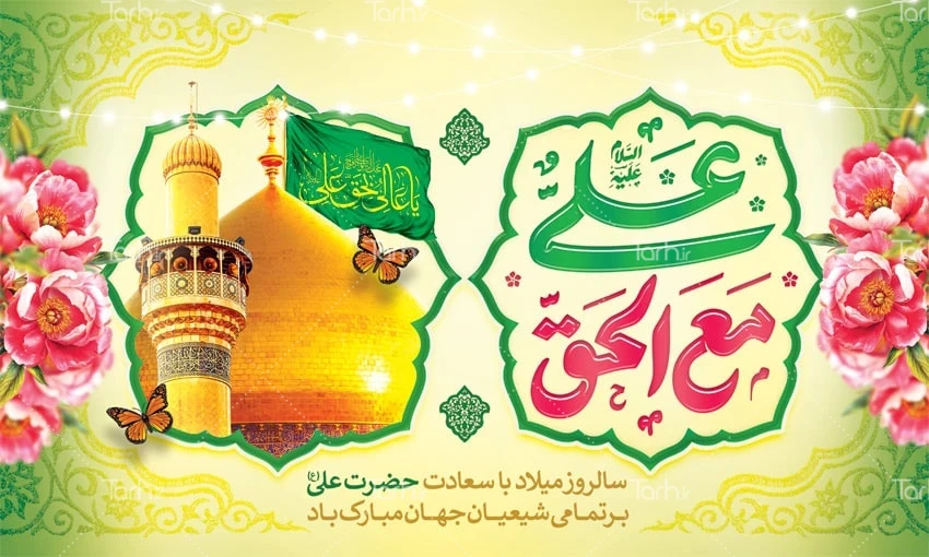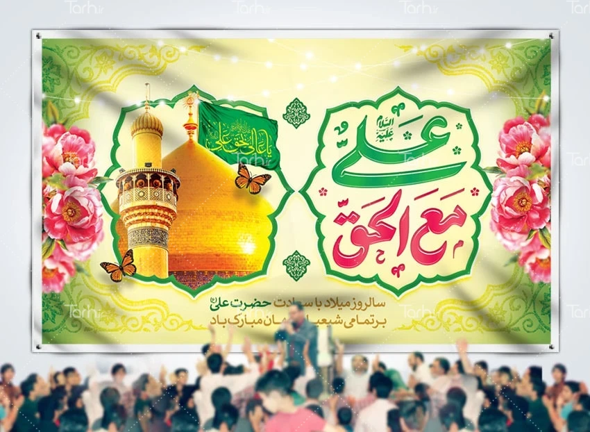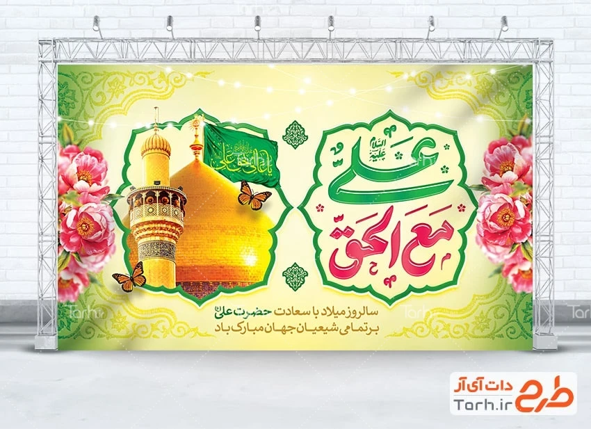 طرح لایه باز بنر دکور ولادت حضرت علی با تایپوگرافی علی مع الحق کد فایل 4389650