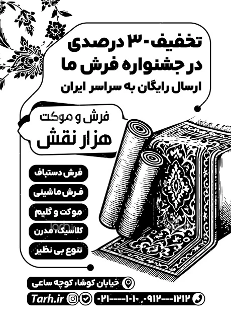 ابعاد تراکت تبلیغاتی سیاه و سفید فرش و موکت در جدول ویژگیهای فایل درجشده و با توجه به لایه باز بودن و کیفیت بالای طرح تراکت ریسو فرش فروشی، قابلیت ویرایش و تبدیل به سایز دلخواه، همچنین چاپ روی متریالهای مختلف مانند انواع کاغذ، گلاسه، کاغذ الوان و ... را دارا میباشد. همچنین میتوان طرح سیاه سفید قالی فروشی را در زمینه های چاپ سیلک ، نایلون، ساک دستی، پاکت دستی و کیسه نیز استفاده کرد. تراکت های سیاه سفید یا ریسو یک ابزار تبلیغاتی بسیار موثر محسوب می شوند و به دلیل هزینه کم و تأثیر بالا، در بسیاری از کسب و کارها به عنوان روشی اقتصادی و موثر برای انتقال اطلاعات به مخاطبان برای تبلیغات و رویدادهای مختلف استفاده میشوند.