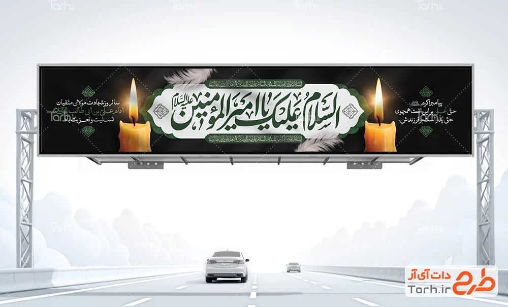 دانلود بنر پل هوایی شهادت امام علی با فرمت psd و قابل ویرایش در نرم افزار فتوشاپ به صورت لایه باز توسط تیم طراحان طرح دات آی آر طراحی شده است. در طرح لایه باز شهادت امام علی و شب قدر از تصاویر و المان های با کیفیت و متناسب با استاندارد چاپ استفاده گردیده است. طرح بیلبورد خام شهادت امام علی شامل خوشنویسی السلام علیک یا امیرالمومنین، وکتور پر و تصویر شمع می باشد که المان های استفاده شده در بنر لایه باز شهادت امام علی و شب قدر قابلیت ویرایش، جابه جایی و تغییر سایز را دارا بوده و شما می توانید متناسب با سلیقه خودتان طرح بنر شهادت امیر المؤمنین را ویرایش نمایید.