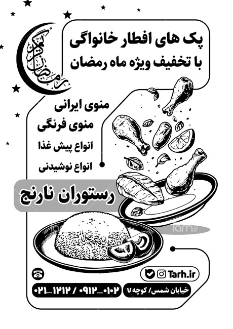 طرح تراکت ریسو رستوران با تخفیف رمضان با فرمت psd، مد رنگی گری اسکیل(Grayscale) و قابل ویرایش در نرمافزار فتوشاپ بهصورت لایه باز توسط تیم طراحان طرح دات آی آر طراحی شده است. در نمونه تراکت سیاه و سفید رستوران از تصاویر و المانهای باکیفیت و متناسب با استاندارد چاپ استفادهشده، همچنین نکات مهم در طرح لایه باز تراکت ریسو رستوران مانند رنگبندی، رعایت حاشیه، فاصلهها، فضای کافی برای درج متن، سایز و نوع فونت مناسب طراحی تراکت ریسو و ... رعایت گردیده است. طرح لایه باز سیاه سفید رستوران در ماه رمضان شامل وکتور ظرف غذای ایرانی میباشد که المانهای استفادهشده در طرح تراکت سیاه سفید کبابی و رستوران قابلیت ویرایش، جابهجایی و تغییر سایز را دارا بوده و شما میتوانید متناسب باسلیقه خودتان تراکت لایه باز سیاه و سفید رستوران با تخفیف رمضان را ویرایش نمایید، همچنین با تغییر تصاویر و متنها میتوانید طرح تراکت سیاه سفید غذا پزی را به طرح تراکت ریسو کسب و کار مد نظر خود شخصی سازی نمایید.