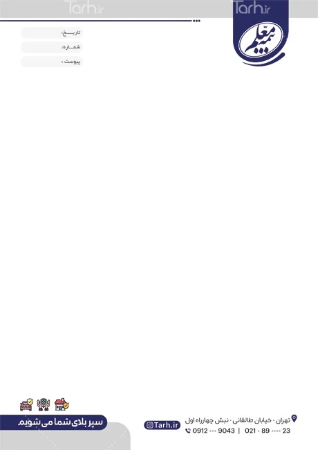 طرح آماده سربرگ کارگزاری بیمه معلم با فرمت psd و قابل ویرایش در نرمافزار فتوشاپ بهصورت لایه باز توسط تیم طراحان طرح دات آی آر طراحی شده است. در طرح لایه باز سربرگ دفتر بیمه از المانهای باکیفیت و متناسب با استاندارد چاپ استفادهشده، همچنین نکات مهم در طرح سربرگ خام بیمه معلم مانند رنگبندی، رعایت حاشیه، فاصلهها، فضای کافی برای درج متن، سایز و نوع فونت مناسب طراحی سربرگ و ... رعایت گردیده است. سربرگ لایه باز بیمه معلم شامل لوگو بیمه معلم و محل جایگذاری مشخصات میباشد که المانهای استفادهشده در نمونه سربرگ بیمه معلم قابلیت ویرایش، جابهجایی و تغییر سایز را دارا بوده و شما میتوانید متناسب باسلیقه خودتان طرح سربرگ دفتر بیمه را ویرایش نمایید، همچنین با تغییر لوگو و متنها میتوانید طرح سربرگ کارگزاری بیمه معلم را به طرح سربرگ کسب و کار مد نظر خود شخصی سازی نمایید. در اسناد و نامههای اداری و تجاری، سربرگ به عنوان وسیلهای برای نمایش اطلاعاتی مانند نام و لوگو یک شرکت یا سازمان، عنوان سند، تاریخ، شماره صفحه و اطلاعات تماس ( شماره تلفن، آدرس پستی، وبسایت و ایمیل) به کار میرود. این اطلاعات به دریافتکننده کمک میکند تا به راحتی با شرکت یا سازمان تماس بگیرد یا از منابع اطلاعاتی بیشتری بهرهبرداری کند.