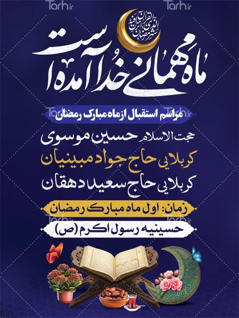 طرح لایه باز بنر اطلاعیه مراسم استقبال از رمضان با خوشنویسی ماه مهمانی خدا آمده است کد فایل 4609752