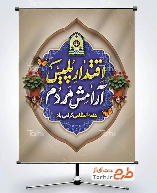 پوستر خام هفته نیروی انتظامی با فرمت psd و قابل ویرایش در نرم افزار فتوشاپ به صورت لایه باز توسط تیم طراحان طرح دات آی آر طراحی شده است. در دانلود طرح بنر هفته انتظامی از تصاویر و المانهای با کیفیت و متناسب با استاندارد چاپ استفاده گردیده است. طرح لایه باز تبریک روز نیروی انتظامی شامل عکس لوگو فرماندهی انتظامی، خوشنویسی اقتدار پلیس آرامش مردم، وکتور گلدان و پروانه می باشد. المانهای استفاده شده در طرح بنر روز نیروی انتظامی قابلیت ویرایش، جابه جایی و تغییر سایز را دارا بوده و شما می توانید متناسب با سلیقه خودتان بنر لایه باز هفته انتظامی را ویرایش نمایید.