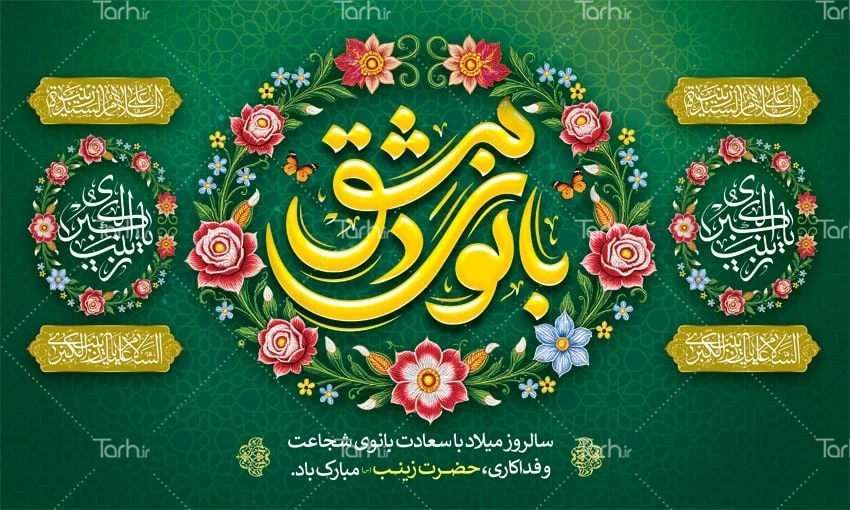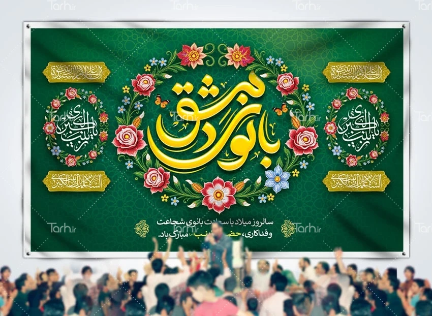 بنر پشت سن ولادت حضرت زینب با فرمت psd و قابل ویرایش در نرم افزار فتوشاپ به صورت لایه باز توسط تیم طراحان طرح دات آی آر طراحی شده است. در طرح لایه باز بنر ولادت حضرت زینب از تصاویر و المان های با کیفیت و متناسب با استاندارد چاپ استفاده گردیده است. طرح بنر پشت منبری ولادت حضرت زینب شامل تایپوگرافی بانوی دمشق، السلام علی السیده زینب، السلام علیک یا زینب کبری و وکتور گل می باشد که المان های استفاده شده در طرح بنر پشت مداح ولادت حضرت زینب قابلیت ویرایش، جابه جایی و تغییر سایز را دارا بوده و شما می توانید متناسب با سلیقه خودتان طرح بنر دکور ولادت حضرت زینب را ویرایش نمایید.