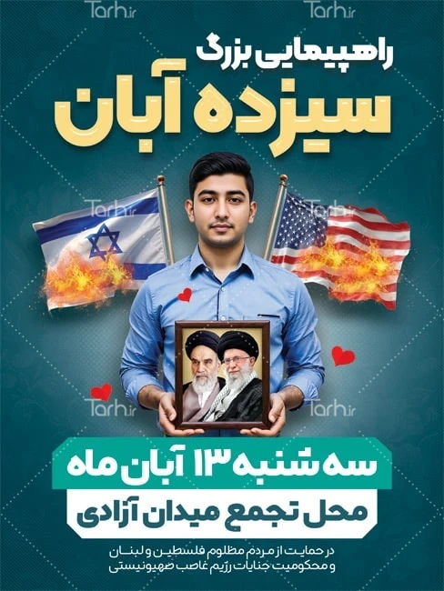 طرح بنر اطلاع رسانی راهپیمایی 13 آبان با فرمت psd و قابل ویرایش در نرم افزار فتوشاپ به صورت لایه باز توسط تیم طراحان طرح دات آی آر طراحی شده است. در طرح بنر 13 آبان از تصاویر و المان های با کیفیت و متناسب با استاندارد چاپ استفاده گردیده است. طرح پوستر اطلاعیه راهپیمایی روز دانش آموز شامل عکس دانش آموز و زمان و مکان تجمع می باشد که المان های استفاده شده در طرح لایه باز بنر روز دانش آموز قابلیت ویرایش، جابه جایی و تغییر سایز را دارا بوده و شما می توانید متناسب با سلیقه خودتان طرح اطلاع رسانی راهپیمایی 13 آبان را ویرایش نمایید.