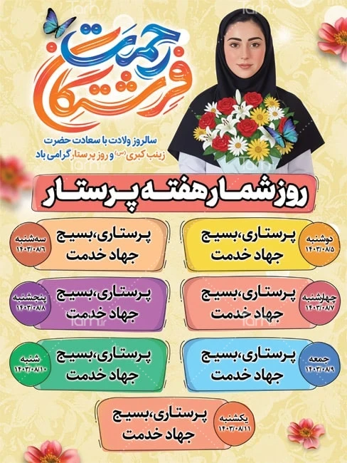 دانلود پوستر روز شمار روز پرستار با فرمت psd و قابل ویرایش در نرم افزار فتوشاپ به صورت لایه باز توسط تیم طراحان طرح دات آی آر طراحی شده است. در طرح لایه باز روزشمار روز پرستار از تصاویر و المان های با کیفیت و متناسب با استاندارد چاپ استفاده گردیده است. پوستر روزشمار روز پرستار لایه باز شامل خوشنویسی فرشتگان رحمت، تصویر پرستار، وکتور گل و جدول روز شمار می باشد که المان های استفاده شده در بنر لایه باز روزشمار روز پرستار قابلیت ویرایش، جابه جایی و تغییر سایز را دارا بوده و شما می توانید متناسب با سلیقه خودتان طرح بنر روز شمار هفته پرستار را ویرایش نمایید.