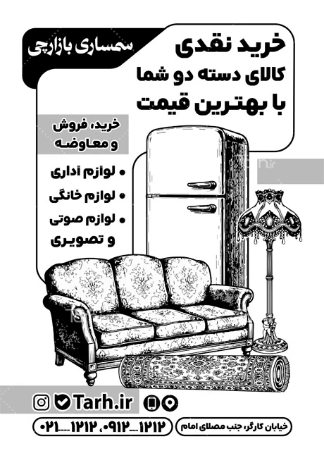 طرح خام تراکت تک رنگ امانت فروشی با فرمت psd، مد رنگی گری اسکیل(Grayscale) و قابل ویرایش در نرمافزار فتوشاپ بهصورت لایه باز توسط تیم طراحان طرح دات آی آر طراحی شده است. در نمونه تراکت سیاه و سفید فروش لوازم دست دوم از تصاویر و المانهای باکیفیت و متناسب با استاندارد چاپ استفادهشده، همچنین نکات مهم در طرح تراکت ریسو سمساری مانند رنگبندی، رعایت حاشیه، فاصلهها، فضای کافی برای درج متن، سایز و نوع فونت مناسب طراحی تراکت ریسو و ... رعایت گردیده است. طرح لایه باز تراکت سیاه سفید سمساری شامل وکتور یخچال، فرش، چراغ خواب و مبل میباشد که المانهای استفادهشده در طرح تراکت سیاه سفید فروش لوازم خانگی دست دوم قابلیت ویرایش، جابهجایی و تغییر سایز را دارا بوده و شما میتوانید متناسب باسلیقه خودتان تراکت سیاه و سفید سمساری را ویرایش نمایید، همچنین با تغییر تصاویر و متنها میتوانید طرح تراکت سیاه سفید لوازم خانگی دست دوم را به طرح تراکت ریسو کسب و کار مد نظر خود شخصی سازی نمایید.