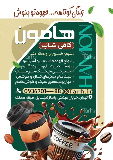 تراکت آماده کافی شاپ با فرمت psd و قابل ویرایش در نرمافزار فتوشاپ بهصورت لایه باز توسط تیم طراحان طرح دات آی آر طراحی شده است. در نمونه تراکت کافی شاپ از تصاویر و المانهای باکیفیت و متناسب با استاندارد چاپ استفادهشده، همچنین نکات مهم در طرح تراکت قهوه فروشی مانند رنگبندی، رعایت حاشیه، فاصلهها، فضای کافی برای درج متن، سایز و نوع فونت مناسب طراحی تراکت و ... رعایت گردیده است. طرح لایه باز تراکت کافه شامل عکس فنجان قهوه میباشد که المانهای استفادهشده در طرح تراکت فروشگاه قهوه قابلیت ویرایش، جابهجایی و تغییر سایز را دارا بوده و شما میتوانید متناسب باسلیقه خودتان تراکت لایه باز کافه را ویرایش نمایید، همچنین با تغییر تصاویر و متنها میتوانید طرح تراکت کافه را به طرح تراکت کسب و کار مد نظر خود شخصی سازی نمایید.
