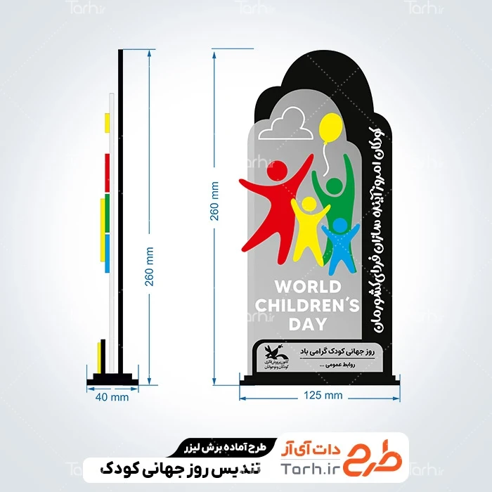 فایل تندیس روز جهانی کودک با نرم افزار Corel Draw به صورت لایه باز و قابل ویرایش توسط تیم طراحان طرح دات آی آر طراحی شده است. در طرح آماده برش لیزری استند روز جهانی کودک نکات مهم طراحی لیزر مانند رعایت ضخامت چوب، ابعاد استاندارد طرح و چیدمان درست برای کمترین پرتی رعایت گردیده است. طرح لیزر تندیس روز کودک، آماده اجرا توسط دستگاه های برش، سی ان سی (CNC)، حکاکی لیزر و حکاکی روی چوب میباشد. شما میتوانید از طرح لیزر روز جهانی کودک جهت تولید انواع تندیس و استند روز جهانی کودک به عنوان هدیه در مراسمات روز کودک استفاده کنید.