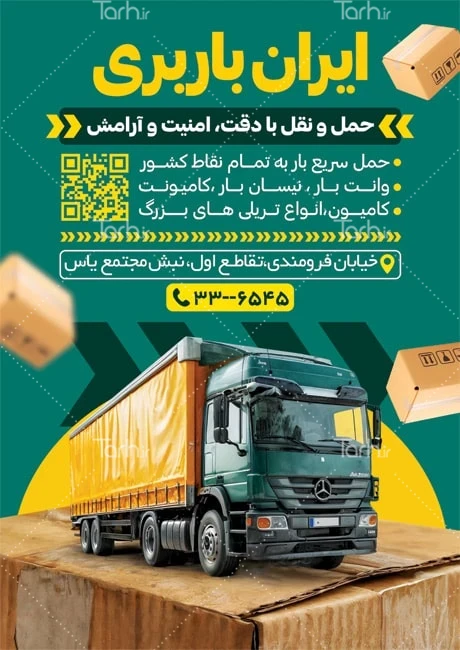 طرح تراکت تبلیغاتی شرکت حمل و نقل با فرمت psd و قابل ویرایش در نرمافزار فتوشاپ بهصورت لایه باز توسط تیم طراحان طرح دات آی آر طراحی شده است. در نمونه تراکت باربری از تصاویر و المانهای باکیفیت و متناسب با استاندارد چاپ استفادهشده، همچنین نکات مهم در طرح تراکت باربری مانند رنگبندی، رعایت حاشیه، فاصلهها، فضای کافی برای درج متن، سایز و نوع فونت مناسب طراحی تراکت و ... رعایت گردیده است. طرح لایه باز تراکت حمل و نقل شامل عکس کامیون میباشد که المانهای استفادهشده در طرح تراکت حمل و نقل قابلیت ویرایش، جابهجایی و تغییر سایز را دارا بوده و شما میتوانید متناسب باسلیقه خودتان تراکت لایه باز باربری را ویرایش نمایید، همچنین با تغییر تصاویر و متنها میتوانید طرح تراکت خدمات حمل و نقل را به طرح تراکت کسب و کار مد نظر خود شخصی سازی نمایید.
