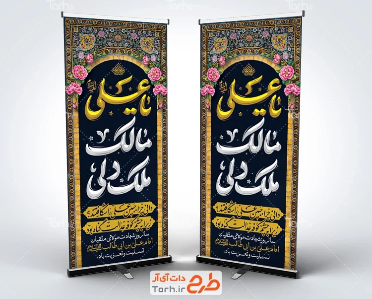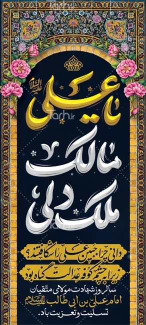 طرح لایه باز بنر ایستاده شهادت حضرت علی با تایپوگرافی یا علی مالک ملک دلی کد فایل 4875691