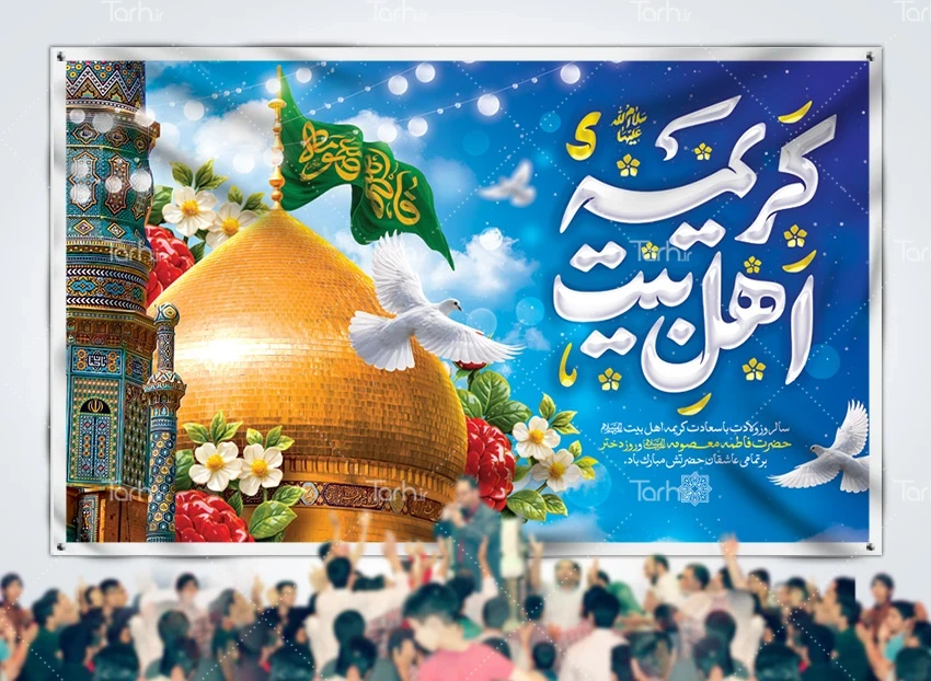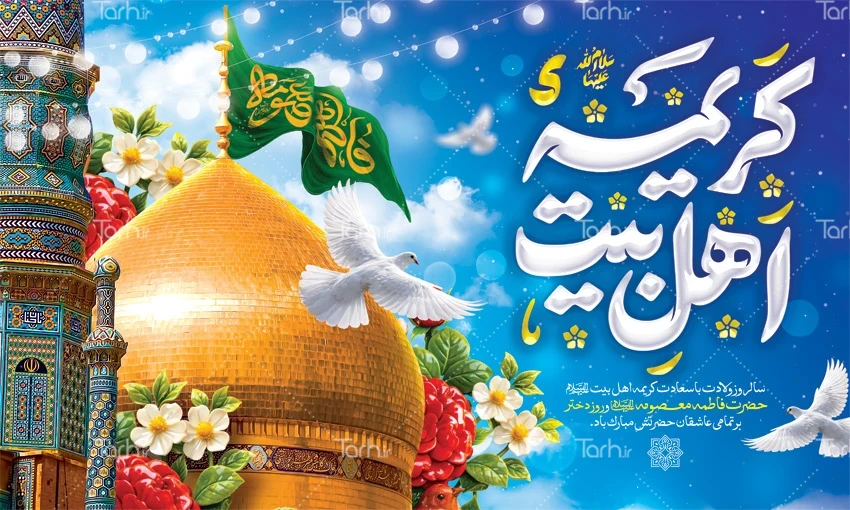طرح بنر پشت سن ولادت حضرت معصومه با خوشنویسی کریمه اهل بیت کد فایل 4950218