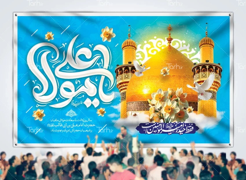 طرح لایه باز بنر پشت سن میلاد امام علی شامل خوشنویسی یا مولا علی کد فایل 4961052
