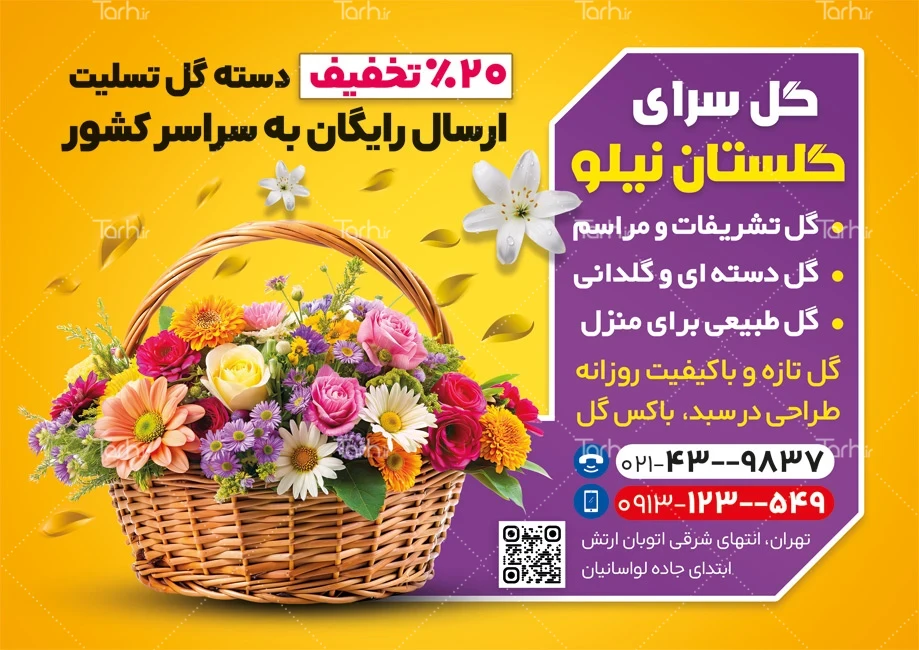 طرح لایه باز تراکت تبلیغاتی گل فروشی دارای عکس سبد گل کد فایل 4986302