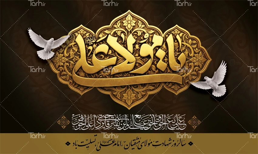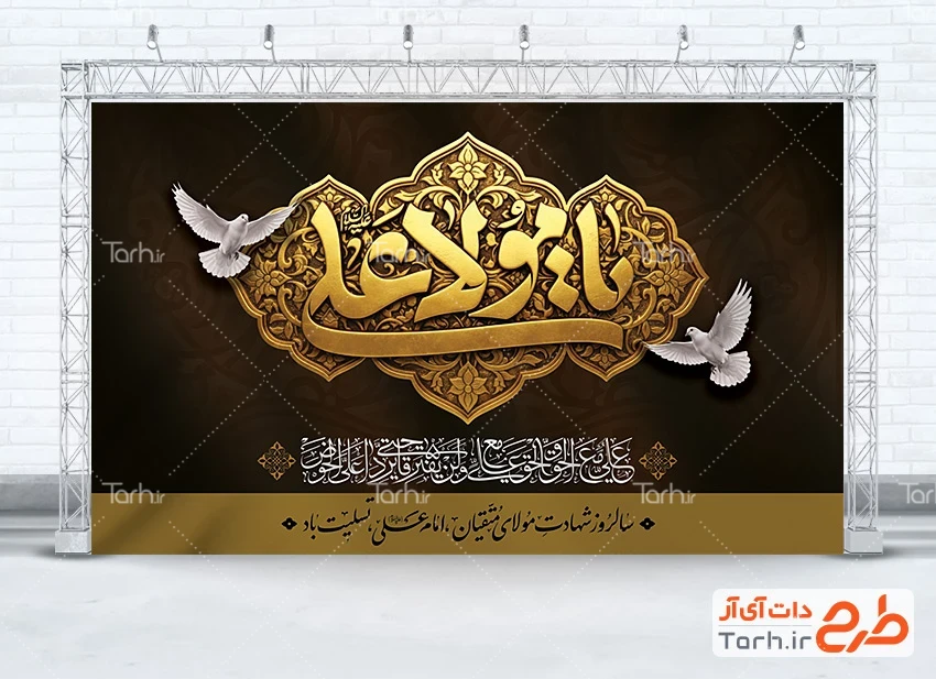 طرح لایه باز بنر پشت منبر شهادت امام علی دارای خوشنویسی یا علی مولا کد فایل 5031698