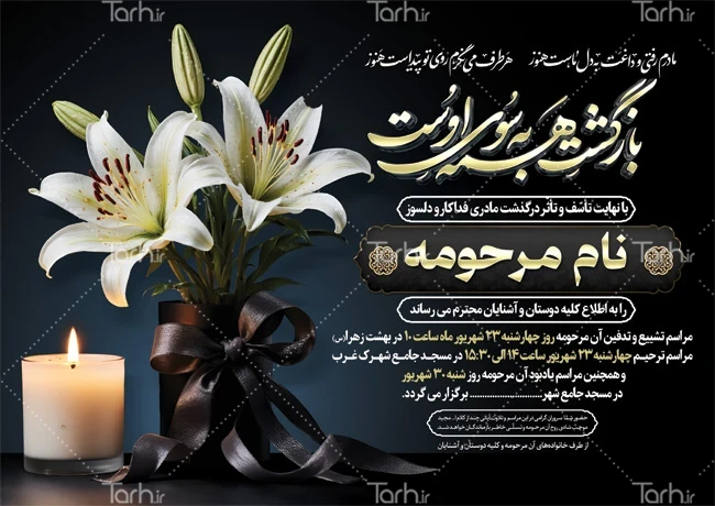 دانلود آگهی فوت مادر با فرمت psd و قابل ویرایش در نرمافزار فتوشاپ بهصورت لایه باز توسط تیم طراحان طرح دات آی آر طراحی شده است. در فایل اعلامیه ترحیم مادر از تصاویر و المانهای باکیفیت و متناسب با استاندارد چاپ استفادهشده، همچنین نکات مهم در طرح آگهی ترحیم مادر مانند رنگبندی، رعایت حاشیه، فاصلهها، فضای کافی برای درج متن، سایز و نوع فونت مناسب طراحی آگهی ترحیم و ... رعایت گردیده است. طرح لایه باز آگهی فوت مادر شامل خوشنویسی بازگشت همه به سوی اوست میباشد که المانهای استفادهشده در آگهی ترحیم لایه باز مادر قابلیت ویرایش، جابهجایی و تغییر سایز را دارا بوده و شما میتوانید متناسب باسلیقه خودتان نمونه اعلامیه ترحیم مادر را ویرایش نمایید.