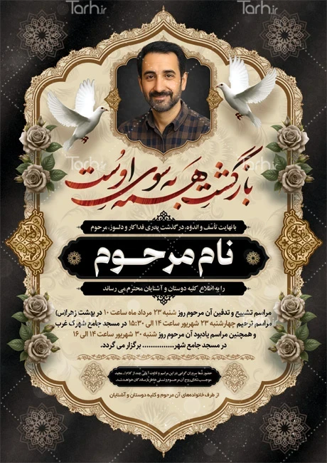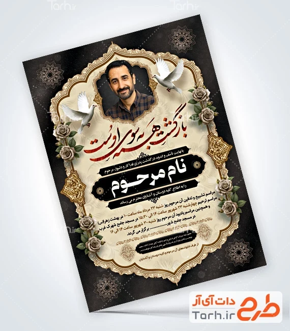 طرح خام آگهی فوت پدر با فرمت psd و قابل ویرایش در نرمافزار فتوشاپ بهصورت لایه باز توسط تیم طراحان طرح دات آی آر طراحی شده است. در فایل لایه باز اعلامیه ترحیم پدر از تصاویر و المانهای باکیفیت و متناسب با استاندارد چاپ استفادهشده، همچنین نکات مهم در طرح آگهی ترحیم پدر مانند رنگبندی، رعایت حاشیه، فاصلهها، فضای کافی برای درج متن، سایز و نوع فونت مناسب طراحی آگهی ترحیم و ... رعایت گردیده است. طرح آگهی ترحیم پدر شامل جایگاه عکس پدر، خوشنویسی بازگشت همه به سوی اوست و وکتور کبوتر میباشد که المانهای استفادهشده در آگهی ترحیم لایه باز پدر قابلیت ویرایش، جابهجایی و تغییر سایز را دارا بوده و شما میتوانید متناسب باسلیقه خودتان نمونه اعلامیه ترحیم پدر را ویرایش نمایید.
