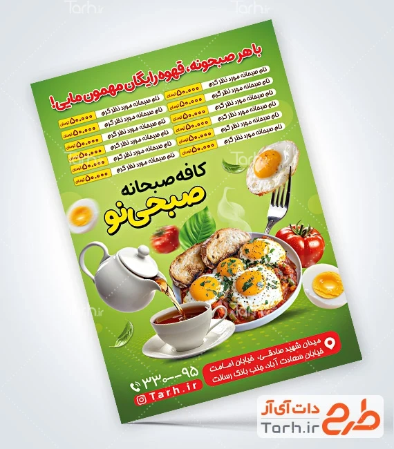 طرح قابل ویرایش تراکت کافه صبحانه با تم سبز کد فایل 5064918