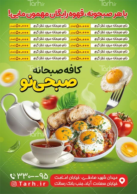 طرح قابل ویرایش تراکت کافه صبحانه با فرمت psd و قابل ویرایش در نرمافزار فتوشاپ بهصورت لایه باز توسط تیم طراحان طرح دات آی آر طراحی شده است. در نمونه تراکت کافه صبحانه از تصاویر و المانهای باکیفیت و متناسب با استاندارد چاپ استفادهشده، همچنین نکات مهم در طرح تراکت کافه صبحانه مانند رنگبندی، رعایت حاشیه، فاصلهها، فضای کافی برای درج متن، سایز و نوع فونت مناسب طراحی تراکت و ... رعایت گردیده است. طرح لایه باز تراکت صبحانه خوری شامل عکس نیمرو و چای میباشد که المانهای استفادهشده در طرح تراکت صبحانه خوری قابلیت ویرایش، جابهجایی و تغییر سایز را دارا بوده و شما میتوانید متناسب باسلیقه خودتان تراکت لایه باز کافه صبحانه و رستوران را ویرایش نمایید، همچنین با تغییر تصاویر و متنها میتوانید تراکت لایه باز رستوران را به طرح تراکت کسب و کار مد نظر خود شخصی سازی نمایید.