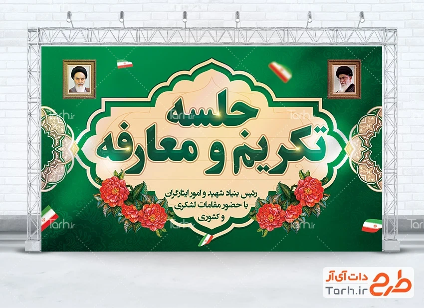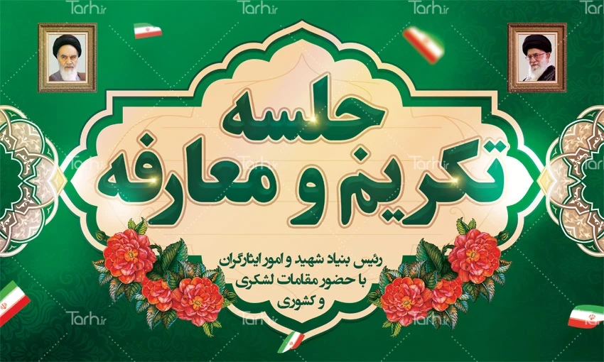 طرح قابل ویرایش بنر جلسه تکریم و معارفه با فرمت psd و قابل ویرایش در نرم افزار فتوشاپ به صورت لایه باز توسط تیم طراحان طرح دات آی آر طراحی شده است. در طرح لایه باز تودیع و معارفه از تصاویر و المان های با کیفیت و متناسب با استاندارد چاپ استفاده گردیده است. پوستر تودیع و معارفه لایه باز شامل قاب عکس رهبری، امام خمینی و عکس پرچم ایران می باشد که المان های استفاده شده در طرح بنر جلسه تکریم و معارفه قابلیت ویرایش، جابه جایی و تغییر سایز را دارا بوده و شما می توانید متناسب با سلیقه خودتان طرح تودیع و معارفه را ویرایش نمایید.