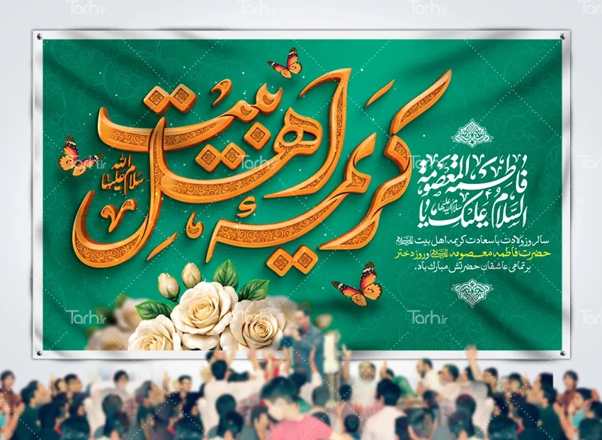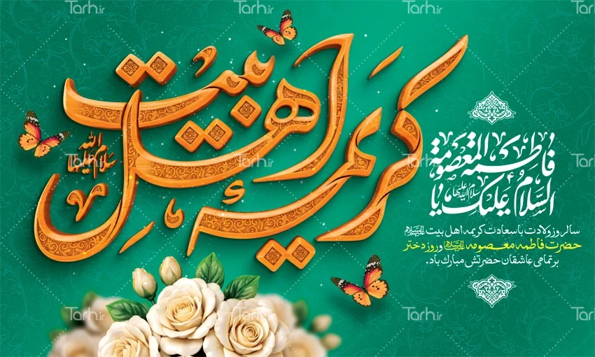 طرح بنر دکور ولادت حضرت معصومه با خوشنویسی کریمه اهل بیت کد فایل 5086341
