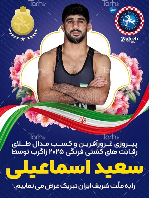 طرح بنر قهرمانی کشتی فرنگی سعید اسماعیلی با فرمت psd و قابل ویرایش در نرم افزار فتوشاپ به صورت لایه باز توسط تیم طراحان طرح دات آی آر طراحی شده است. در طرح لایه باز تبریک قهرمانی ورزشی از تصاویر و المان های با کیفیت و متناسب با استاندارد چاپ استفاده گردیده است. طرح بنر تبریک مدال طلا سعید اسماعیلی شامل عکس پهلوان سعید اسماعیلی، وکتور گل و پرچم ایران می باشد که المان های استفاده شده در بنر لایه باز تبریک قهرمانی سعید اسماعیلی قابلیت ویرایش، جابه جایی و تغییر سایز را دارا بوده و شما می توانید متناسب با سلیقه خودتان پوستر تبریک قهرمانی را ویرایش نمایید.