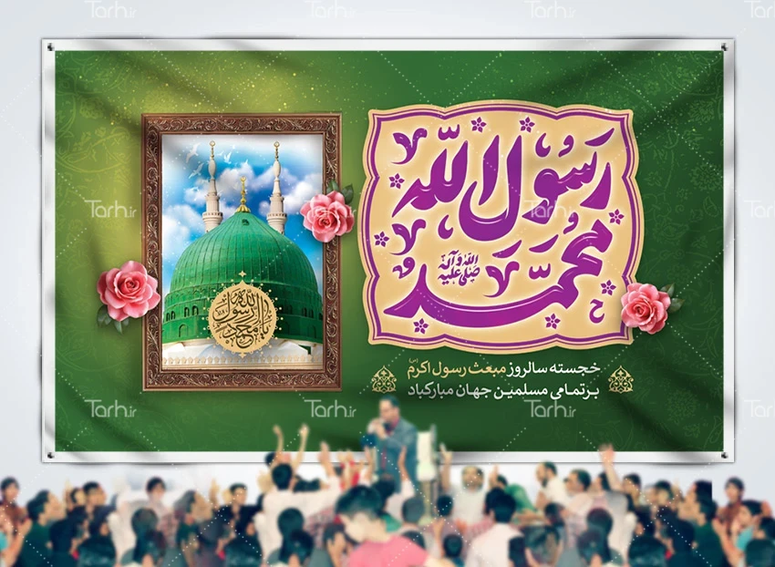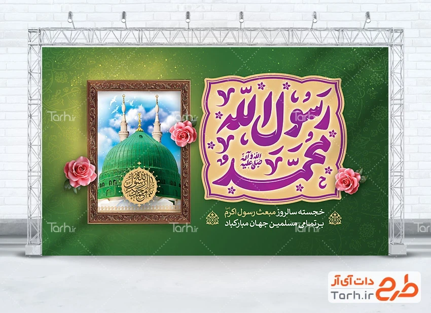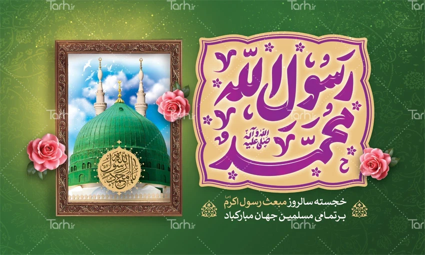 طرح لایه باز بنر پشت سن عید مبعث با تایپوگرافی محمد رسول الله کد فایل 5183649