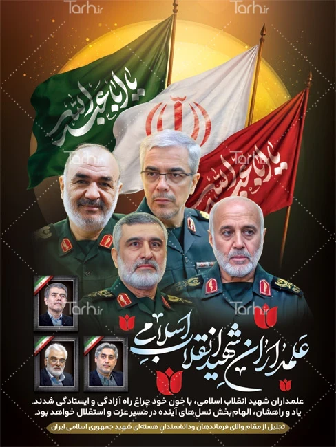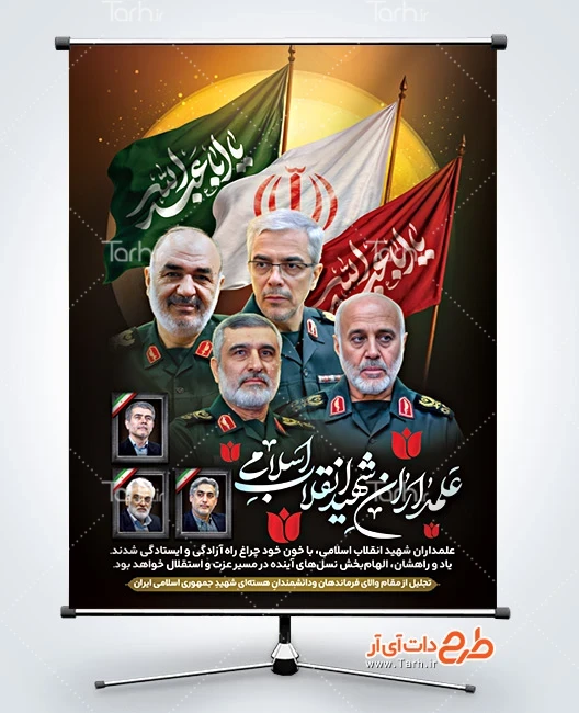 طرح پوستر محرم و فرماندهان شهید سپاه با فرمت psd و قابل ویرایش در نرم افزار فتوشاپ به صورت لایه باز توسط تیم طراحان طرح دات آی آر طراحی شده است. در طرح لایه باز محرم و سردارن شهید سپاه از تصاویر و المان های با کیفیت و متناسب با استاندارد چاپ استفاده گردیده است. طرح بنر محرم و شهادت سردار سلامی شامل با تایپوگرافی یا ابا عبدالله، خوشنویسی علمداران شهید انقلاب اسلامی، عکس سردار شهید حاجی زاده، سردار شهید سلامی، سردار شهید باقری، سردار شهید رشید می باشد که المان های استفاده شده در پوستر لایه باز محرم قابلیت ویرایش، جابه جایی و تغییر سایز را دارا بوده و شما می توانید متناسب با سلیقه خودتان پوستر خام محرم را ویرایش نمایید.