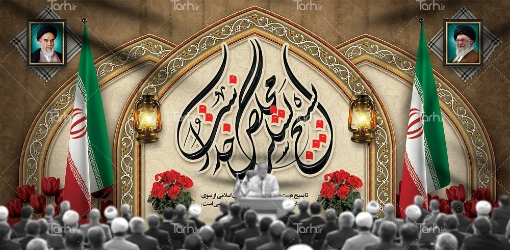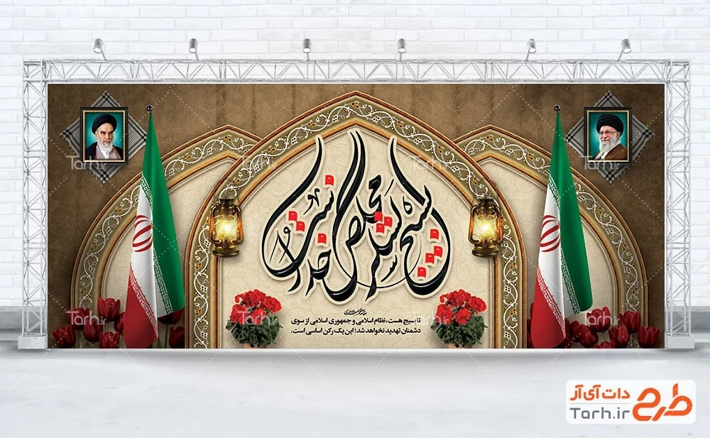 طرح بنر لایه باز پشت سن گرامیداشت هفته بسیج با فرمت psd و قابل ویرایش در نرم افزار فتوشاپ به صورت لایه باز توسط تیم طراحان طرح دات آی آر طراحی شده است. در طرح لایه باز هفته بسیج از تصاویر و المان های با کیفیت و متناسب با استاندارد چاپ استفاده گردیده است. طرح بنر دکور لایه باز هفته بسیج شامل تایپوگرافی بسیج لشکر مخلص خداست، متن سخن رهبری، عکس رهبر و امام خمینی و وکتور گل و پرچم ایران می باشد که المان های استفاده شده در طرح بنر دکور هفته بسیج قابلیت ویرایش، جابه جایی و تغییر سایز را دارا بوده و شما می توانید متناسب با سلیقه خودتان طرح بنر هفته بسیج را ویرایش نمایید.
