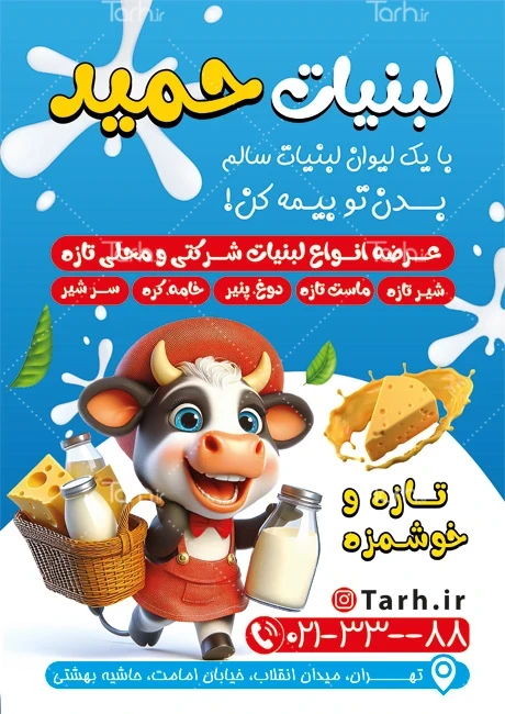 دانلود تراکت لبنیاتی با فرمت psd و قابل ویرایش در نرمافزار فتوشاپ بهصورت لایه باز توسط تیم طراحان طرح دات آی آر طراحی شده است. در نمونه تراکت لبنیاتی از تصاویر و المانهای باکیفیت و متناسب با استاندارد چاپ استفادهشده، همچنین نکات مهم در طرح تراکت لبنیاتی مانند رنگبندی، رعایت حاشیه، فاصلهها، فضای کافی برای درج متن، سایز و نوع فونت مناسب طراحی تراکت و ... رعایت گردیده است. طرح لایه باز تراکت فروشگاه لبنیات شامل تصویرسازی گاو، عکس پنیر، ماست، لیوان شیر، تخم مرغ و متن تبلیغاتی سوپر لبنیات میباشد که المانهای استفادهشده در طرح تراکت فروشگاه لبنیات قابلیت ویرایش، جابهجایی و تغییر سایز را دارا بوده و شما میتوانید متناسب باسلیقه خودتان تراکت لایه باز لبنیاتی را ویرایش نمایید، همچنین با تغییر تصاویر و متنها میتوانید طرح تراکت سوپرلبنیات را به طرح تراکت کسب و کار مد نظر خود شخصی سازی نمایید.
