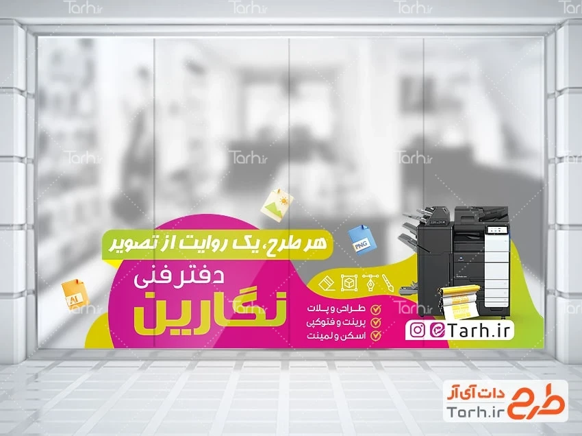 طرح آماده استیکر دفتر فنی روی شیشه مغازه با عکس دستگاه چاپ کد فایل 5246839
