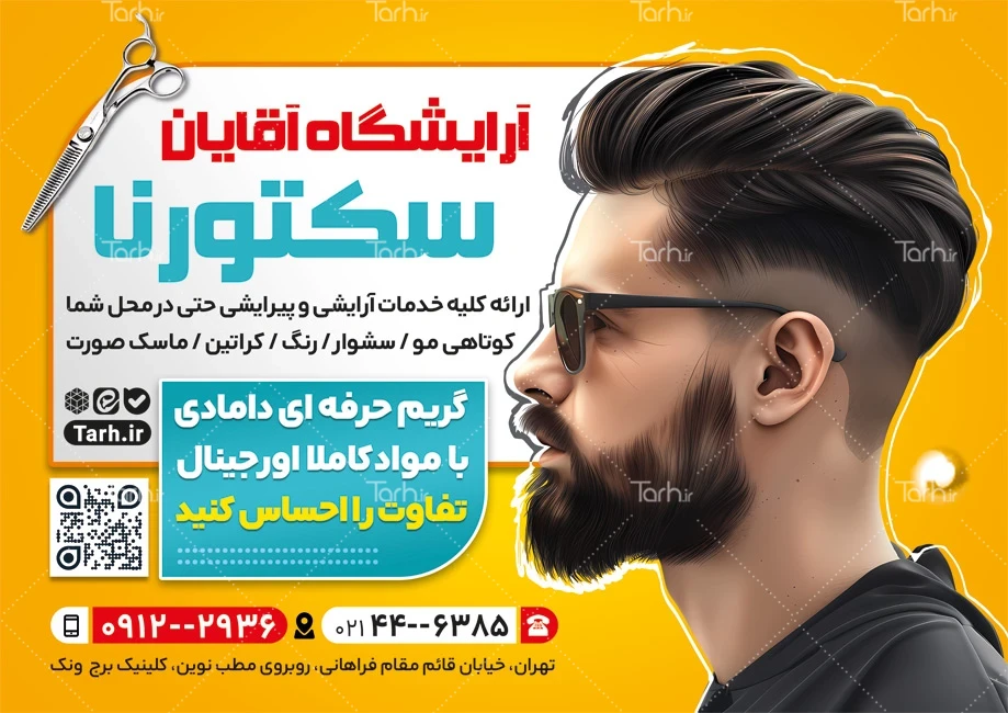 نمونه تراکت آماده آرایشگاه آقایان با فرمت psd و قابل ویرایش در نرمافزار فتوشاپ بهصورت لایه باز توسط تیم طراحان طرح دات آی آر طراحی شده است. در نمونه تراکت آرایشگاه آقایان از تصاویر و المانهای باکیفیت و متناسب با استاندارد چاپ استفادهشده، همچنین نکات مهم در طرح تراکت آرایشگاه مردانه مانند رنگبندی، رعایت حاشیه، فاصلهها، فضای کافی برای درج متن، سایز و نوع فونت مناسب طراحی تراکت و ... رعایت گردیده است. طرح لایه باز تراکت آرایشگاه آقایان شامل عکس مدل مرد میباشد که المانهای استفادهشده در طرح تراکت آرایشگاه آقایان قابلیت ویرایش، جابهجایی و تغییر سایز را دارا بوده و شما میتوانید متناسب باسلیقه خودتان تراکت آرایشگاه مردانه را ویرایش نمایید، همچنین با تغییر تصاویر و متنها میتوانید طرح تراکت سلمانی را به طرح تراکت کسب و کار مد نظر خود شخصی سازی نمایید.