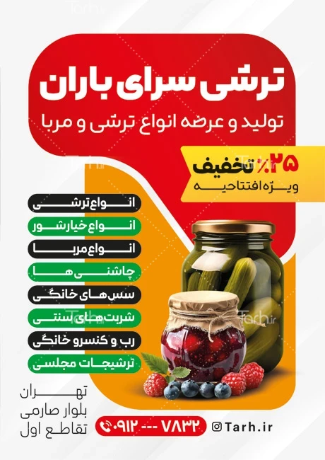 طرح تراکت تبلیغاتی ترشی و مربا با فرمت psd و قابل ویرایش در نرمافزار فتوشاپ بهصورت لایه باز توسط تیم طراحان طرح دات آی آر طراحی شده است. در نمونه تراکت فروشگاه ترشی از تصاویر و المانهای باکیفیت و متناسب با استاندارد چاپ استفادهشده، همچنین نکات مهم در طرح تراکت ترشی و مربا مانند رنگبندی، رعایت حاشیه، فاصلهها، فضای کافی برای درج متن، سایز و نوع فونت مناسب طراحی تراکت و ... رعایت گردیده است. طرح لایه باز تراکت ترشیجات شامل عکس شیشه ترشی و مربا میباشد که المانهای استفادهشده در طرح تراکت ترشیجات قابلیت ویرایش، جابهجایی و تغییر سایز را دارا بوده و شما میتوانید متناسب باسلیقه خودتان تراکت لایه باز ترشی فروشی را ویرایش نمایید، همچنین با تغییر تصاویر و متنها میتوانید طرح تراکت مربا و ترشی را به طرح تراکت کسب و کار مد نظر خود شخصی سازی نمایید.