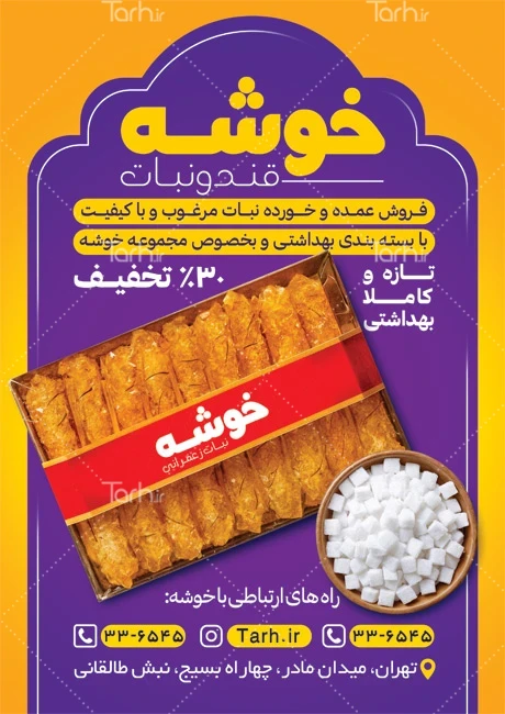 ابعاد طرح تراکت تبلیغاتی قند و نبات در جدول ویژگیهای فایل درجشده و با توجه به لایه باز بودن و کیفیت بالای طرح قند و نبات، قابلیت ویرایش و تبدیل به سایز دلخواه، همچنین چاپ روی متریالهای مختلف مانند بنر، کاغذ، گلاسه و ... را دارا میباشد. برای مثال تراکت خام قند و نبات فروشی در ابعاد A4 رزولوشن 300 dpi قابلیت چاپ بنر و لارج فرمت در ابعاد بزرگتر مانند 3 در 4 متر و بدون افت کیفیت را دارا میباشد. تراکت ها به عنوان یک ابزار تبلیغاتی بسیار موثر محسوب می شوند و به دلیل هزینه کم و تأثیر بالا، در بسیاری از کسب و کارها به عنوان روشی برای تبلیغات و رویدادهای مختلف مورد استفاده قرار می گیرند.