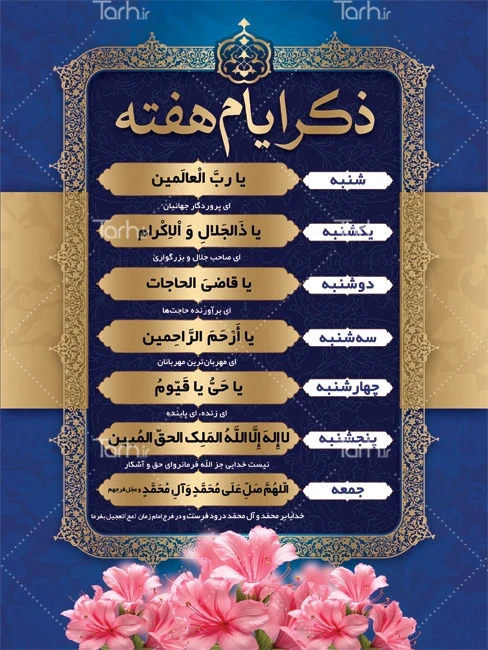طرح آماده بنر ذکر ایام هفته با فرمت psd و قابل ویرایش در نرم افزار فتوشاپ به صورت لایه باز توسط تیم طراحان طرح دات آی آر طراحی شده است. در طرح لایه باز بنر ذکر ایام هفته از تصاویر و المان های با کیفیت و متناسب با استاندارد چاپ استفاده گردیده است. طرح پوستر ذکر ایام هفته شامل متن ذکر ایام هفته، طرح اسلیمی و وکتور گل می باشد که المان های استفاده شده در طرح بنر ذکر روزهای هفته قابلیت ویرایش، جابه جایی و تغییر سایز را دارا بوده و شما می توانید متناسب با سلیقه خودتان طرح لایه باز ذکر ایام هفته را ویرایش نمایید.