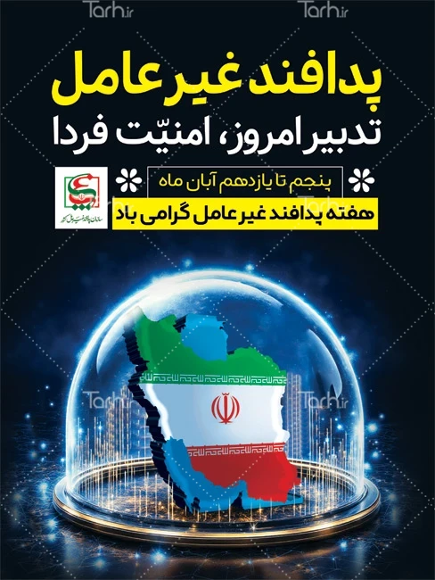 طرح بنر آماده گرامیداشت هفته پدافند غیر عامل با فرمت psd و قابل ویرایش در نرم افزار فتوشاپ به صورت لایه باز توسط تیم طراحان طرح دات آی آر طراحی شده است. در بنر خام تبریک هفته پدافند غیر عامل از تصاویر و المان های با کیفیت و متناسب با استاندارد چاپ استفاده گردیده است. پوستر هفته پدافند غیرعامل شامل متن پدافند غیر عامل تدبیر امروز امنیت فردا، وکتور نقشه ایران و عکس پرچم ایران می باشد که المان های استفاده شده در طرح لایه باز بنر هفته پدافند غیر عامل قابلیت ویرایش، جابه جایی و تغییر سایز را دارا بوده و شما می توانید متناسب با سلیقه خودتان طرح هفته پدافند غیرعامل را ویرایش نمایید.