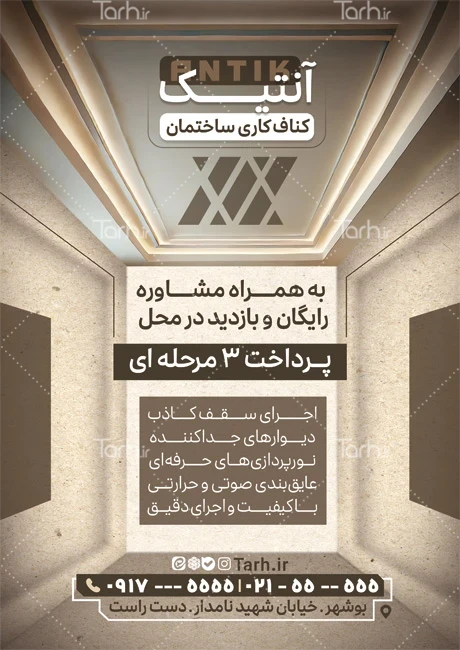 ابعاد طرح پوستر تبلیغاتی تبلیغاتی کناف ساختمان در جدول ویژگیهای فایل درجشده و با توجه به لایه باز بودن و کیفیت بالای طرح سقف کاذب، قابلیت ویرایش و تبدیل به سایز دلخواه، همچنین چاپ روی متریالهای مختلف مانند بنر، کاغذ، گلاسه و ... را دارا میباشد. برای مثال تراکت خام کناف کاری در ابعاد A4 رزولوشن 300 dpi قابلیت چاپ بنر و لارج فرمت در ابعاد بزرگتر مانند 3 در 4 متر و بدون افت کیفیت را دارا میباشد. تراکت ها به عنوان یک ابزار تبلیغاتی بسیار موثر محسوب می شوند و به دلیل هزینه کم و تأثیر بالا، در بسیاری از کسب و کارها به عنوان روشی برای تبلیغات و رویدادهای مختلف مورد استفاده قرار می گیرند.
