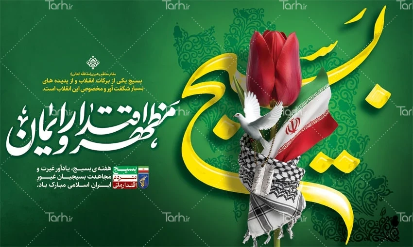 دانلود طرح بنر گرامیداشت هفته بسیج با فرمت psd و قابل ویرایش در نرم افزار فتوشاپ به صورت لایه باز توسط تیم طراحان طرح دات آی آر طراحی شده است. در طرح لایه باز بنر هفته بسیج از تصاویر و المان های با کیفیت و متناسب با استاندارد چاپ استفاده گردیده است. طرح لایه باز هفته بسیج شامل خوشنویسی بسیج، تصویرسازی چفیه و وکتور گل لاله می باشد که المان های استفاده شده در طرح خام هفته بسیج قابلیت ویرایش، جابه جایی و تغییر سایز را دارا بوده و شما می توانید متناسب با سلیقه خودتان طرح هفته بسیج را ویرایش نمایید.