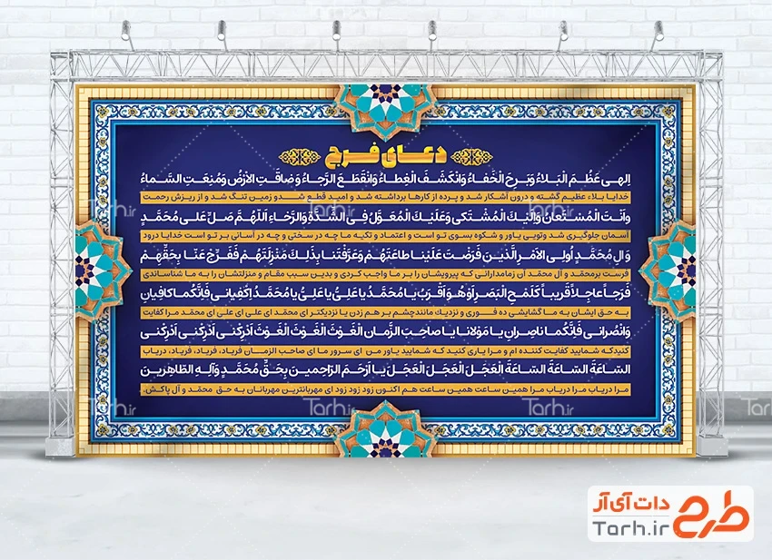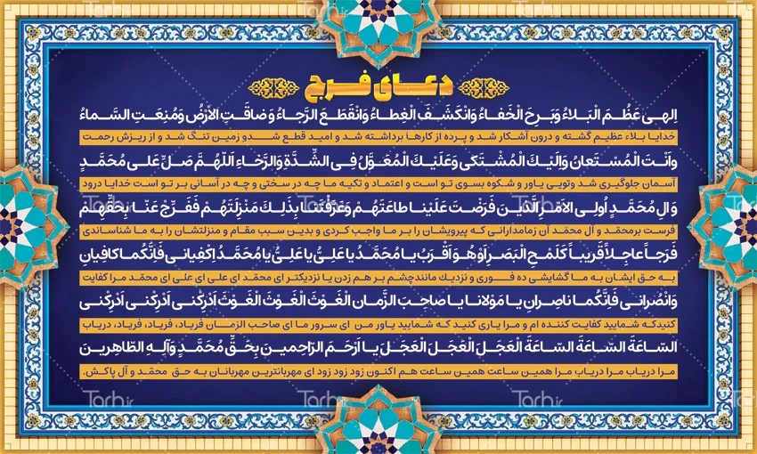 بنر خام دعای فرج با فرمت psd و قابل ویرایش در نرم افزار فتوشاپ به صورت لایه باز توسط تیم طراحان طرح دات آی آر طراحی شده است. در طرح بنر دعای فرج با کیفیت از تصاویر و المان های با کیفیت و متناسب با استاندارد چاپ استفاده گردیده است. طرح لایه باز بنر دعای فرج شامل متن دعای الهی عظم البلا و کادر اسلیمی می باشد که المان های استفاده شده در پوستر لایه باز دعای فرج قابلیت ویرایش، جابه جایی و تغییر سایز را دارا بوده و شما می توانید متناسب با سلیقه خودتان پوستر خام دعا فرج را ویرایش نمایید.