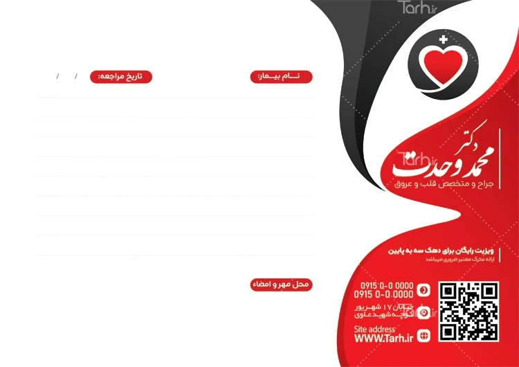 فایل سرنسخه جراح قلب با فرمت psd و قابل ویرایش در نرمافزار فتوشاپ بهصورت لایه باز توسط تیم طراحان طرح دات آی آر طراحی شده است. در طرح لایه باز سرنسخه متخصص قلب از المانهای باکیفیت و متناسب با استاندارد چاپ استفادهشده، همچنین نکات مهم در طرح سرنسخه متخصص قلب مانند رنگبندی، رعایت حاشیه، فاصلهها، فضای کافی برای درج متن، سایز و نوع فونت مناسب طراحی سرنسخه و ... رعایت گردیده است. سرنسخه خام متخصص قلب شامل محل جایگذاری اطلاعات بیمار و نام پزشک میباشد که المانهای استفادهشده در طرح سرنسخه قلب و عروق قابلیت ویرایش، جابهجایی و تغییر سایز را دارا بوده و شما میتوانید متناسب باسلیقه خودتان طرح سر نسخه پزشک را ویرایش نمایید، همچنین با تغییر لوگو و متنها میتوانید طرح سرنسخه پزشک قلب و عروق را به طرح سربرگ دکتر مد نظر خود شخصی سازی نمایید. سربرگ نسخه پزشک به عنوان یک قالب یا برگه کاغذی با سربرگ توسط پزشکان و متخصصان پزشکی برای ایجاد نسخههای مختلف، تجویز دارو، اسناد پزشکی و نامههای پزشکی مورد استفاده قرار میگیرد. سربرگ پزشک معمولاً اطلاعات و مشخصات پزشک را دربرمیگیرد و به پزشکان کمک میکند تا ارتباطات خود با بیماران، دیگر پزشکان، و سایر نهادها را به صورت حرفهای و معتبر انجام دهند و اصالت اسناد پزشکی را حفظ کنند.