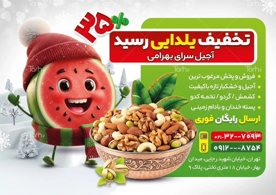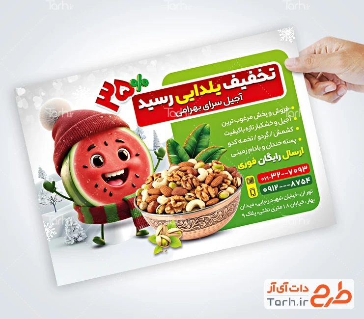 ابعاد قابل چاپ طرح لایه باز تراکت آجیل فروشی ویژه شب یلدا و کاربرد آن