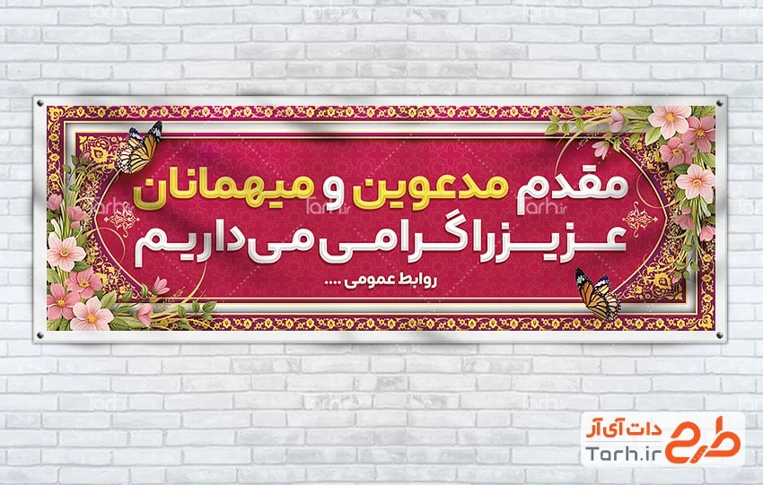 پلاکارد لایه باز خیر مقدم میهمانان با فرمت psd و قابل ویرایش در نرم افزار فتوشاپ به صورت لایه باز توسط تیم طراحان طرح دات آی آر طراحی شده است. در طرح لایه باز بنر خیر مقدم از تصاویر و المان های با کیفیت و متناسب با استاندارد چاپ استفاده گردیده است. طرح بنر خیر مقدم شامل طرح اسلیمی و وکتور گل می باشد که المان های استفاده شده در بنر خیر مقدم مدعوین قابلیت ویرایش، جابه جایی و تغییر سایز را دارا بوده و شما می توانید متناسب با سلیقه خودتان طرح خیرمقدم را ویرایش نمایید.