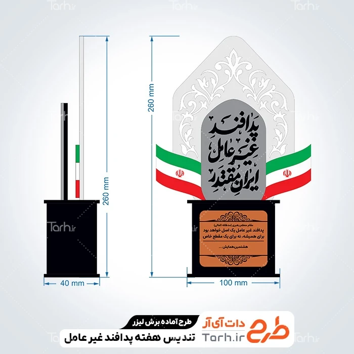 فایل برش لیزری تندیس هفته پدافند غیر عامل با نرم افزار Corel Draw به صورت لایه باز و قابل ویرایش توسط تیم طراحان طرح دات آی آر طراحی شده است. در طرح آماده برش لیزری استند هفته پدافند غیر عامل نکات مهم طراحی لیزر مانند رعایت ضخامت چوب، ابعاد استاندارد طرح و چیدمان درست برای کمترین پرتی رعایت گردیده است. طرح برش لیزری تندیس هفته پدافند غیر عامل، آماده اجرا توسط دستگاه های برش، سی ان سی (CNC)، حکاکی لیزر و حکاکی روی چوب میباشد. شما میتوانید از طرح لیزر هفته پدافند غیر عامل جهت تولید انواع تندیس و استند پدافند غیر عامل به عنوان هدیه در مراسمات هفته پدافند غیر عامل استفاده کنید.