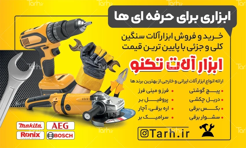 طرح خام بنر ابزارآلات فروشی با فرمت psd و قابل ویرایش در نرمافزار فتوشاپ بهصورت لایه باز توسط تیم طراحان طرح دات آی آر طراحی شده است. در طرح لایه باز بنر ابزار فروشی از تصاویر و المانهای باکیفیت و متناسب با استاندارد چاپ استفادهشده، همچنین نکات مهم در طرح بنر جلو مغازه مانند رنگبندی، رعایت حاشیه، فاصلهها، سایز و نوع فونت مناسب طراحی بنر مشاغل و ... رعایت گردیده است. طرح بنر ابزار آلات شامل عکس دریل و متن تبلیغاتی ابزار فروشی میباشد که المانهای استفادهشده در طرح پوستر ابزار فروشی قابلیت ویرایش، جابهجایی و تغییر سایز را دارا بوده و شما میتوانید متناسب باسلیقه خودتان طرح بنر تبلیغاتی ابزار آلات را ویرایش نمایید، همچنین با تغییر تصاویر و متنها میتوانید طرح پوستر فروشگاه ابزارآلات را به طرح تابلوی شغل موردنظر خود تبدیل نمایید.