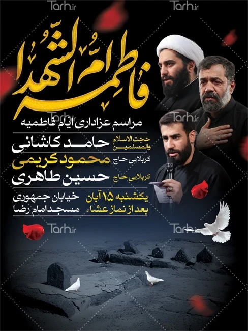 طرح لایه باز پوستر اطلاعیه عزاداری فاطمیه دارای زمان و مکان مراسم عزاداری کد فایل 5697412